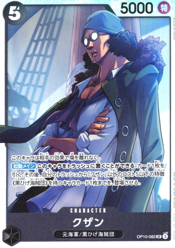 テキスト:このキャラは相手の効果で場を離れない。【起動メイン】このキャラをトラッシュに置くことができる:カード1枚を引く。その後、自分のトラッシュから「クザン」以外のコスト5以下の特徴《黒ひげ海賊団》を持つキャラカード1枚までを、登場させる。