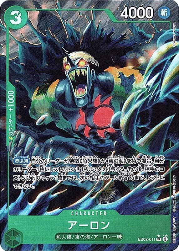 テキスト:【登場時】自分のリーダーが特徴《魚人族》か《東の海》を持つ場合、自分のリーダー1枚にレストのドン‼1枚までを、付与する。その後、相手のコスト5以下のキャラ1枚までは、次の相手のターン終了時まで、レストにできない。