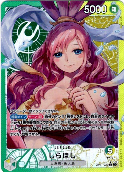 テキスト:このリーダーはアタックできない。【起動メイン】【ターン1回】自分のドン‼1枚をレストにし、自分のライフの上から1枚を表向きにできる:自分の手札から自分の場のドン‼の枚数以下のコストを持つ、特徴《海王類》を持つキャラカードか「メガロ」1枚までを、登場させる。