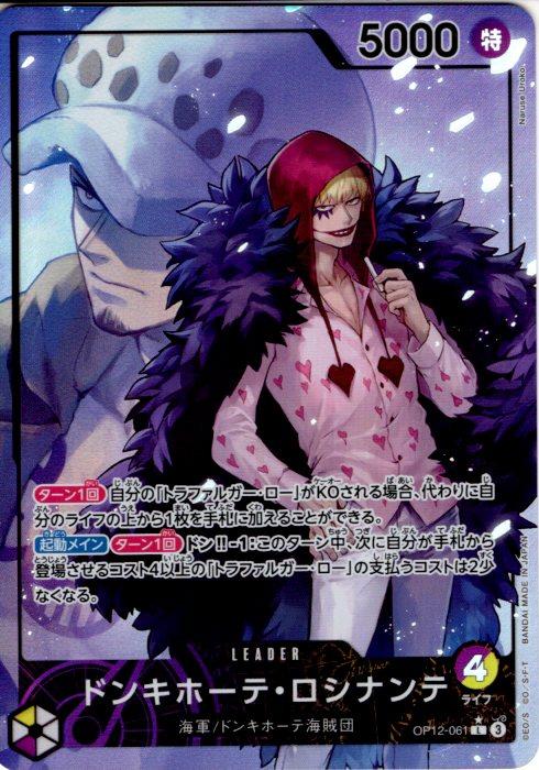 テキスト:【ターン1回】自分の「トラファルガー・ロー」がKOされる場合、代わりに自分のライフの上から1枚を手札に加えることができる。【起動メイン】【ターン1回】ドン‼-1:このターン中、次に自分が手札から登場させるコスト4以上の「トラファルガー・ロー」の支払うコストは2少なくなる。