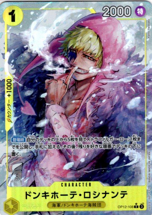 テキスト:【登場時】自分のデッキの上から5枚を見て、「トラファルガー・ロー」1枚までを公開し、手札に加える。その後、残りを好きな順番でデッキの下に置く。