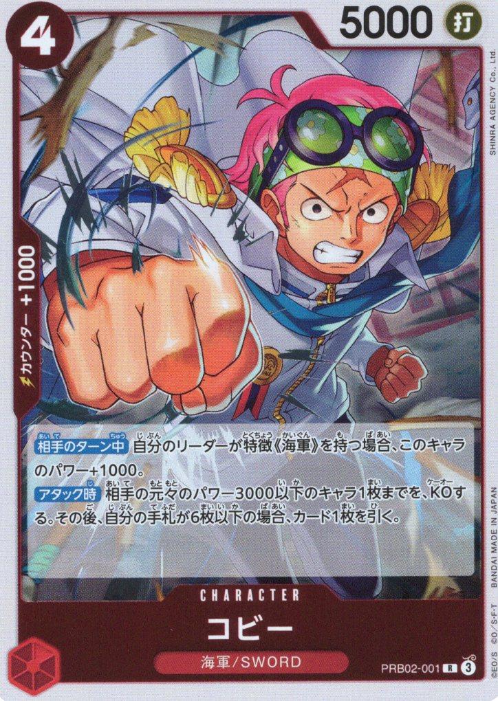 テキスト:【相手のターン中】自分のリーダーが特徴《海軍》を持つ場合、このキャラのパワー+1000。【アタック時】相手の元々のパワー3000以下のキャラ1枚までを、KOする。その後、自分の手札が6枚以下の場合、カード1枚を引く。