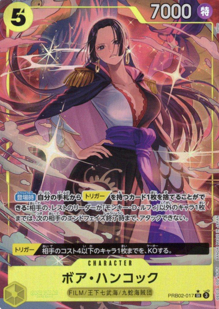 テキスト:【登場時】自分の手札から【トリガー】を持つカード1枚を捨てることができる:相手のレストのリーダーか、「モンキー・D・ルフィ」以外の相手のキャラ1枚までは、次の相手のエンドフェイズ終了時まで、アタックできない。