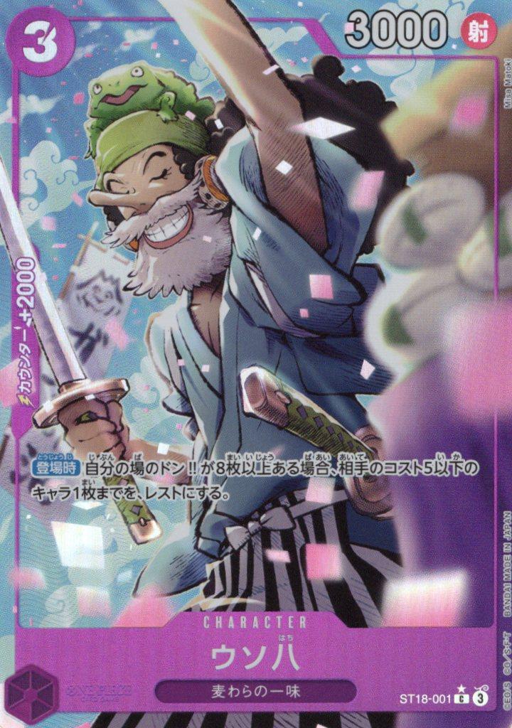 テキスト:【登場時】自分の場のドン‼が8枚以上ある場合、相手のコスト5以下のキャラ1枚までを、レストにする。