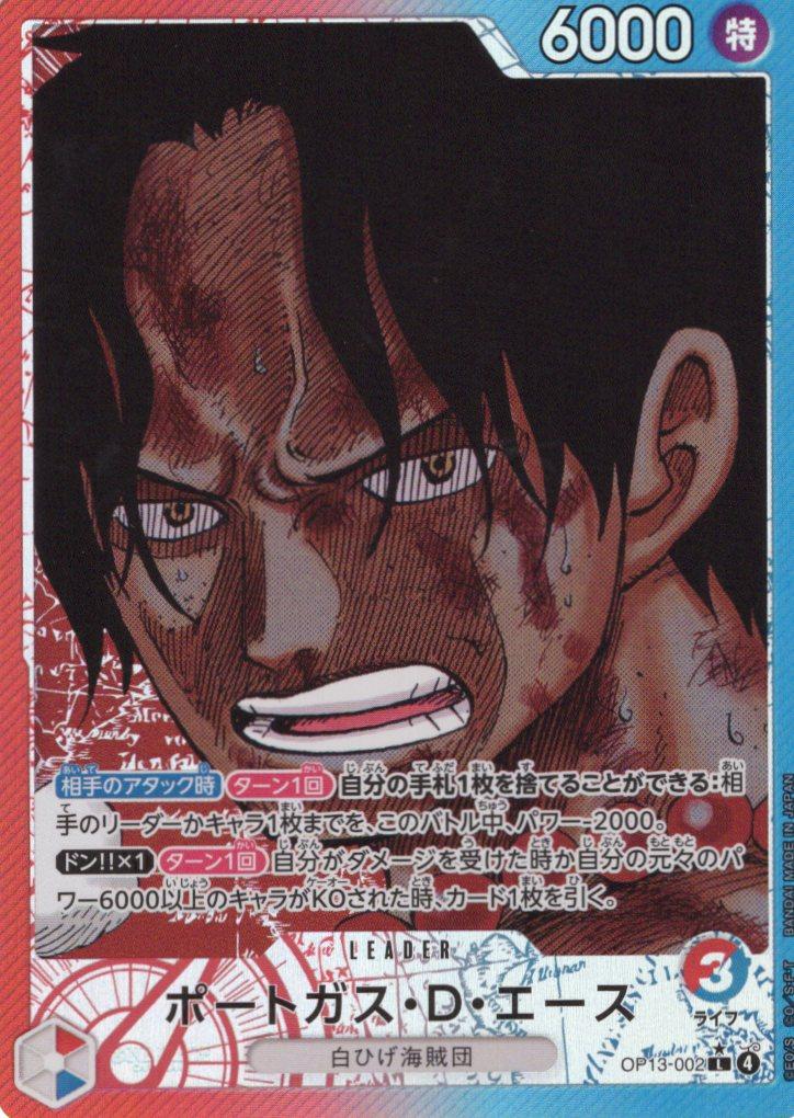 テキスト:【相手のアタック時】【ターン1回】自分の手札1枚を捨てることができる:相手のリーダーかキャラ1枚までを、このバトル中、パワー-2000。【ドン‼×1】【ターン1回】自分がダメージを受けた時か自分の元々のパワー6000以上のキャラがKOされた時、カード1枚を引く。