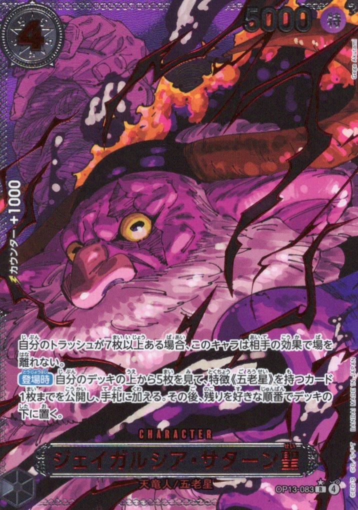 テキスト:自分のトラッシュが7枚以上ある場合、このキャラは相手の効果で場を離れない。【登場時】自分のデッキの上から5枚を見て、特徴《五老星》を持つカード1枚までを公開し、手札に加える。その後、残りを好きな順番でデッキの下に置く。