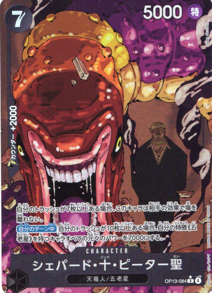 テキスト:自分のトラッシュが7枚以上ある場合、このキャラは相手の効果で場を離れない。【自分のターン中】自分のトラッシュが10枚以上ある場合、自分の特徴《五老星》を持つキャラすべての元々のパワーを7000にする。