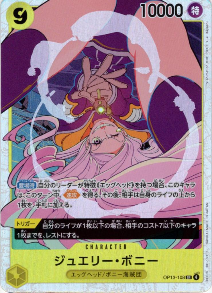 テキスト:【登場時】自分のリーダーが特徴《エッグヘッド》を持つ場合、このキャラは、このターン中、【速攻】を得る。その後、相手は自身のライフの上から1枚を、手札に加える。