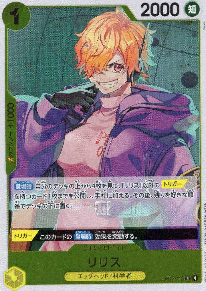 テキスト:【登場時】自分のデッキの上から4枚を見て、「リリス」以外の【トリガー】を持つカード1枚までを公開し、手札に加える。その後、残りを好きな順番でデッキの下に置く。