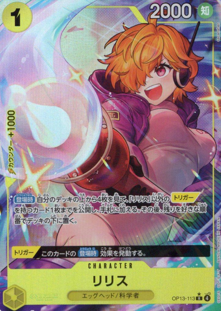 テキスト:【登場時】自分のデッキの上から4枚を見て、「リリス」以外の【トリガー】を持つカード1枚までを公開し、手札に加える。その後、残りを好きな順番でデッキの下に置く。