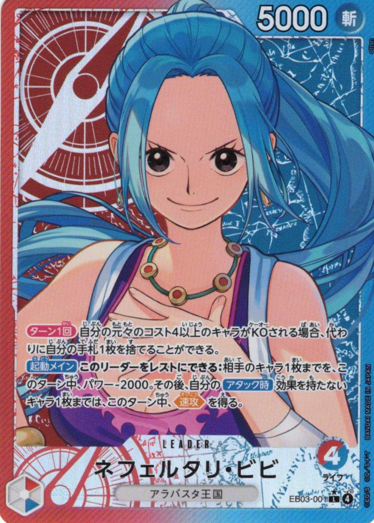 テキスト:【ターン1回】自分の元々のコスト4以上のキャラがKOされる場合、代わりに自分の手札1枚を捨てることができる。【起動メイン】このリーダーをレストにできる:相手のキャラ1枚までを、このターン中、パワー-2000。その後、自分の【アタック時】効果を持たないキャラ1枚までは、このターン中、【速攻】を得る。