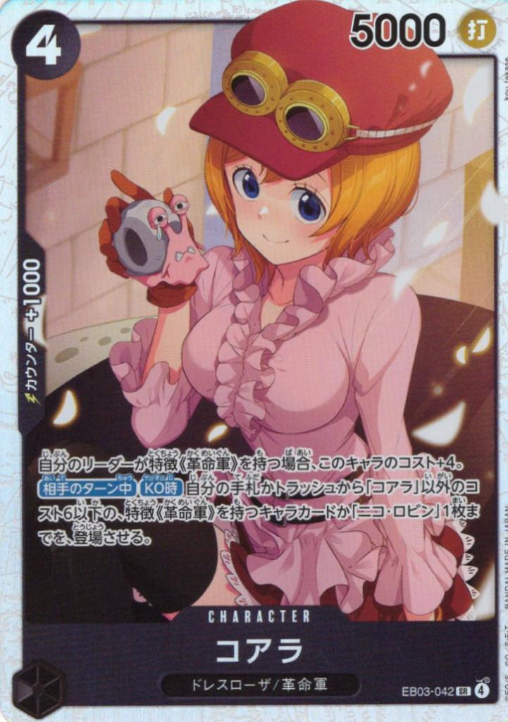 テキスト:自分のリーダーが特徴《革命軍》を持つ場合、このキャラのコスト+4。【相手のターン中】【KO時】自分の手札かトラッシュから「コアラ」以外のコスト6以下の、特徴《革命軍》を持つキャラカードか「ニコ・ロビン」1枚までを、登場させる。