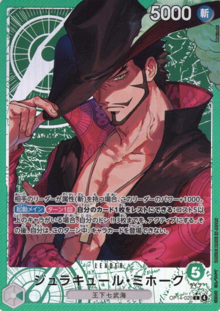 テキスト:相手のリーダーが属性(斬)を持つ場合、このリーダーのパワー+1000。【起動メイン】【ターン1回】自分のカード1枚をレストにできる:コスト5以上のキャラがいる場合、自分のドン‼3枚までを、アクティブにする。その後、自分は、このターン中、キャラカードを登場できない。
