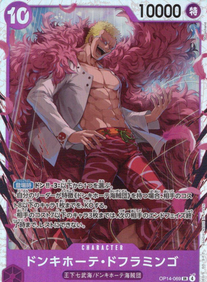 テキスト:【登場時】ドン‼-3:以下から1つを選ぶ。・自分のリーダーが特徴《ドンキホーテ海賊団》を持つ場合、相手のコスト8以下のキャラ1枚までを、KOする。・相手のコスト7以下のキャラ3枚までは、次の相手のエンドフェイズ終了時まで、レストにできない。