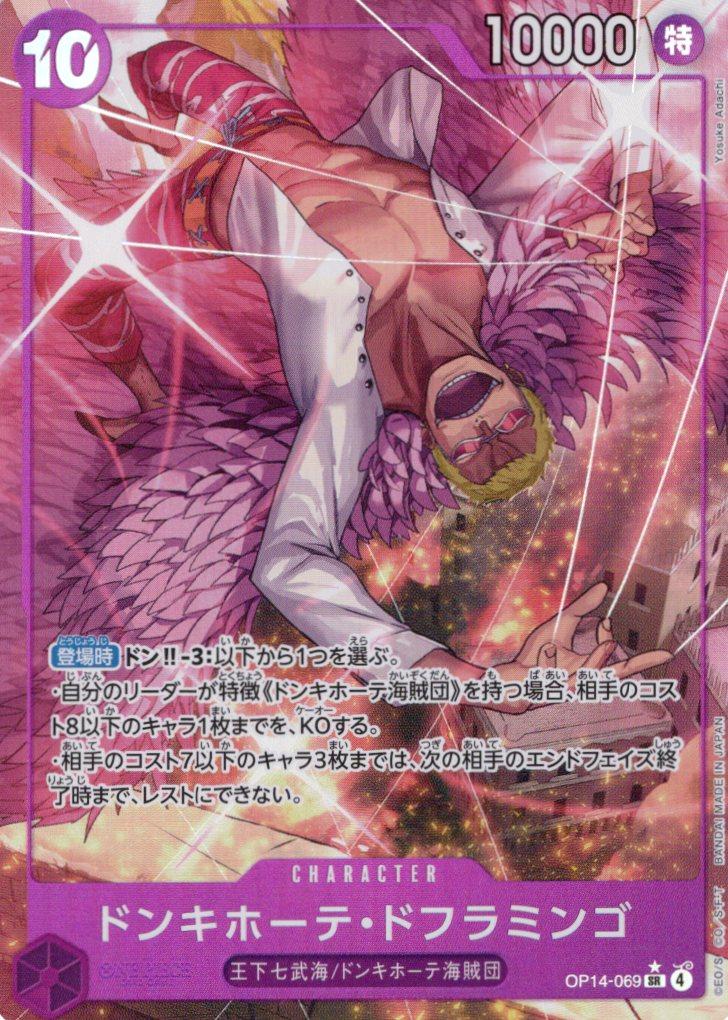 テキスト:【登場時】ドン‼-3:以下から1つを選ぶ。・自分のリーダーが特徴《ドンキホーテ海賊団》を持つ場合、相手のコスト8以下のキャラ1枚までを、KOする。・相手のコスト7以下のキャラ3枚までは、次の相手のエンドフェイズ終了時まで、レストにできない。