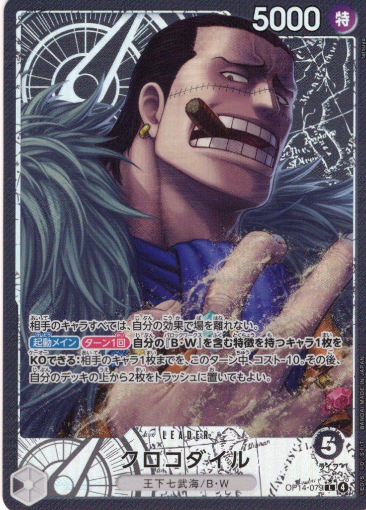 テキスト:相手のキャラすべては、自分の効果で場を離れない。【起動メイン】【ターン1回】自分の『B・W』を含む特徴を持つキャラ1枚をKOできる:相手のキャラ1枚までを、このターン中、コスト-10。その後、自分のデッキの上から2枚をトラッシュに置いてもよい。
