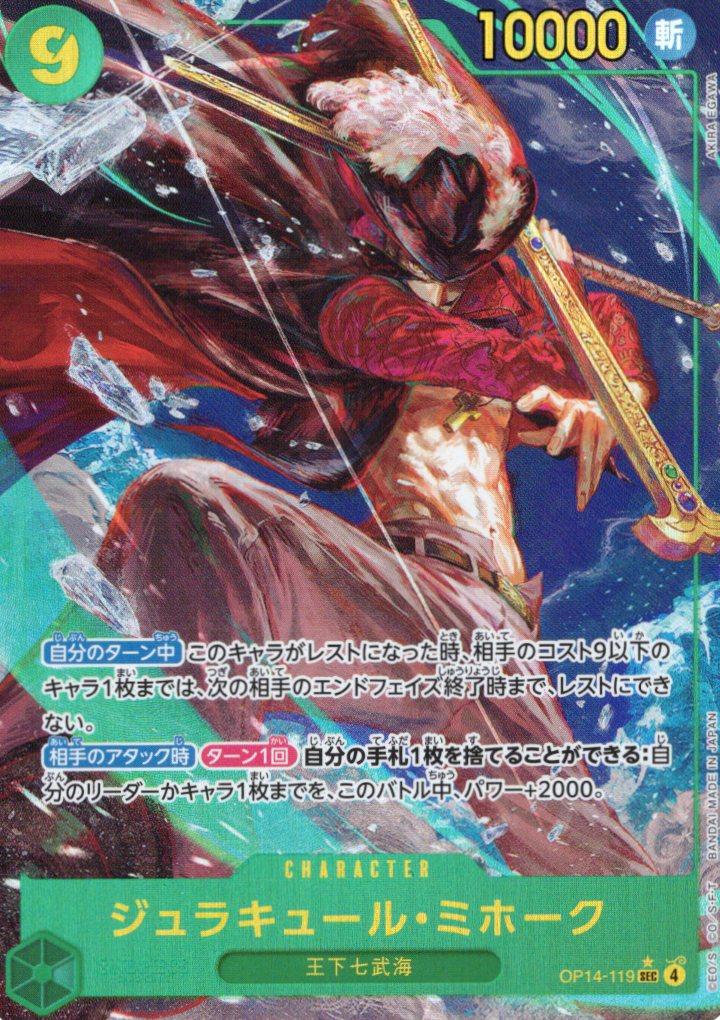 テキスト:【自分のターン中】このキャラがレストになった時、相手のコスト9以下のキャラ1枚までは、次の相手のエンドフェイズ終了時まで、レストにできない。【相手のアタック時】【ターン1回】自分の手札1枚を捨てることができる:自分のリーダーかキャラ1枚までを、このバトル中、パワー+2000。