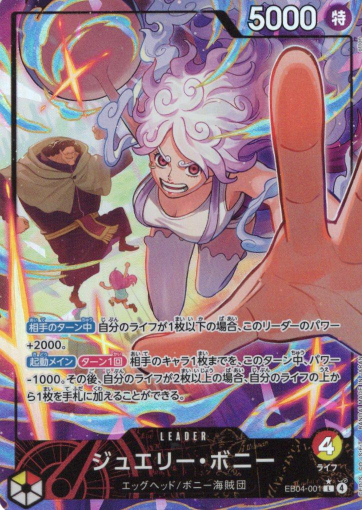 テキスト:【相手のターン中】自分のライフが1枚以下の場合、このリーダーのパワー+2000。【起動メイン】【ターン1回】相手のキャラ1枚までを、このターン中、パワー-1000。その後、自分のライフが2枚以上の場合、自分のライフの上から1枚を手札に加えることができる。