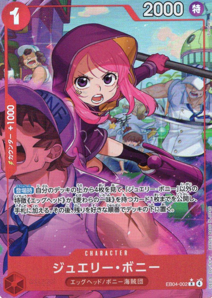テキスト:【登場時】自分のデッキの上から4枚を見て、「ジュエリー・ボニー」以外の特徴《エッグヘッド》か《麦わらの一味》を持つカード1枚までを公開し、手札に加える。その後、残りを好きな順番でデッキの下に置く。
