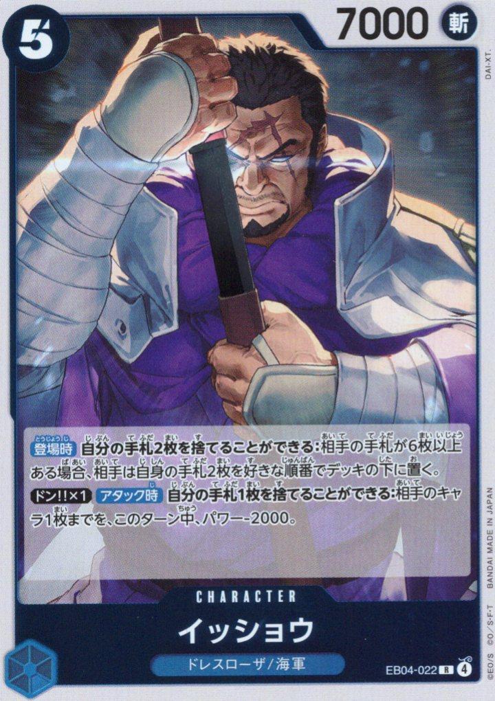 テキスト:【登場時】自分の手札2枚を捨てることができる:相手の手札が6枚以上ある場合、相手は自身の手札2枚を好きな順番でデッキの下に置く。【ドン‼×1】【アタック時】自分の手札1枚を捨てることができる:相手のキャラ1枚までを、このターン中、パワー-2000。
