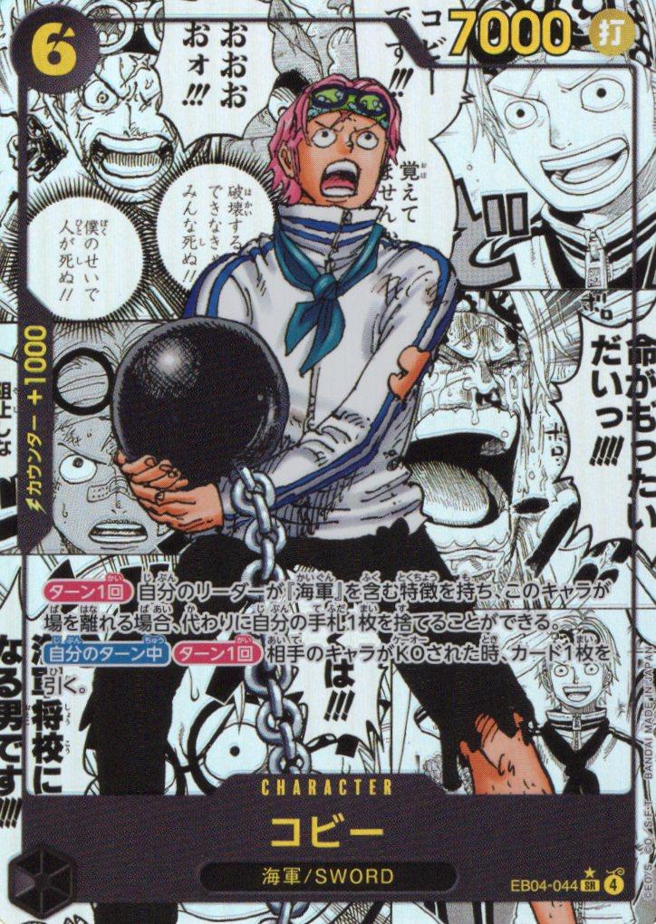 テキスト:【ターン1回】自分のリーダーが『海軍』を含む特徴を持ち、このキャラが場を離れる場合、代わりに自分の手札1枚を捨てることができる。【自分のターン中】【ターン1回】相手のキャラがKOされた時、カード1枚を引く。