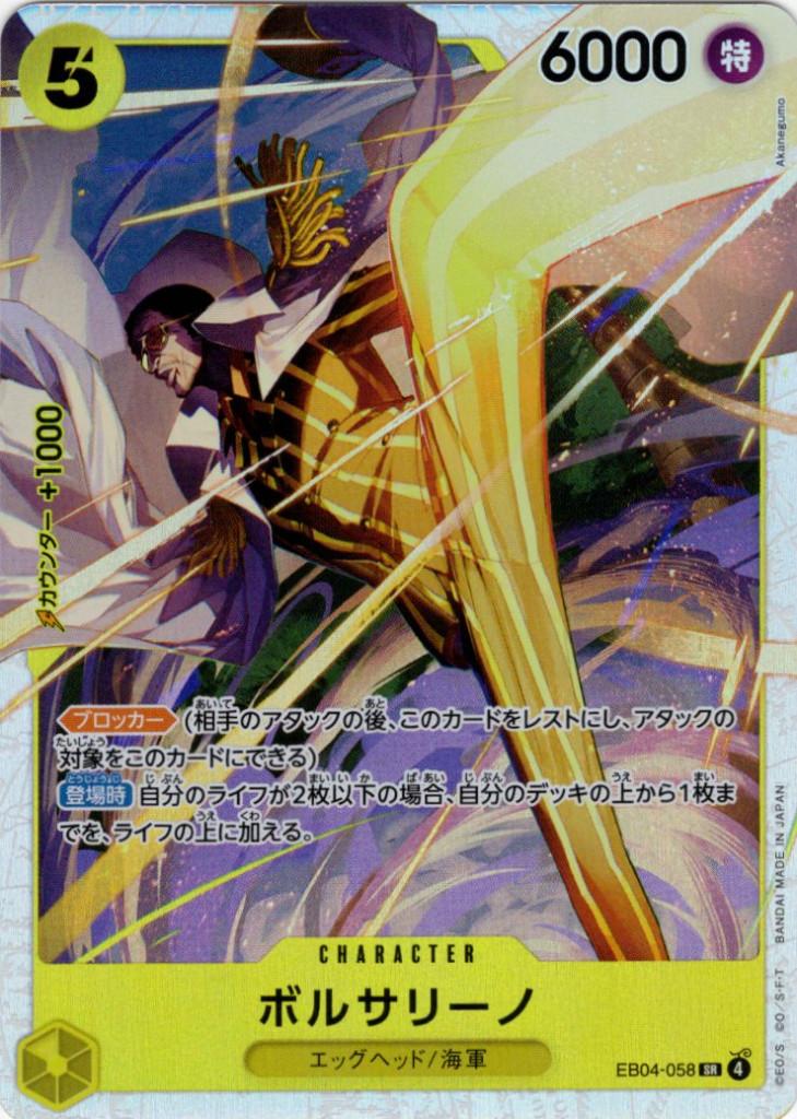 テキスト:【ブロッカー】(相手のアタックの後、このカードをレストにし、アタックの対象をこのカードにできる)【登場時】自分のライフが2枚以下の場合、自分のデッキの上から1枚までを、ライフの上に加える。