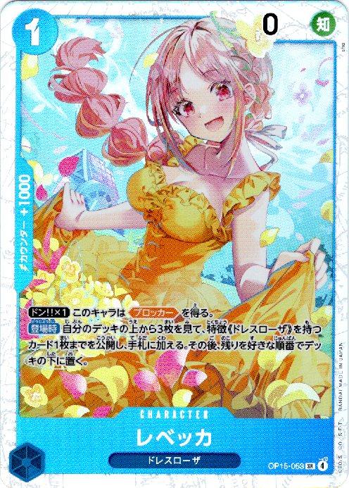 テキスト:【ドン‼×1】このキャラは【ブロッカー】を得る。【登場時】自分のデッキの上から3枚を見て、特徴《ドレスローザ》を持つカード1枚までを公開し、手札に加える。その後、残りを好きな順番でデッキの下に置く。