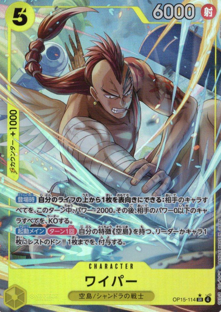 テキスト:【登場時】自分のライフの上から1枚を表向きにできる:相手のキャラすべてを、このターン中、パワー-2000。その後、相手のパワー0以下のキャラすべてを、KOする。【起動メイン】【ターン1回】自分の特徴《空島》を持つ、リーダーかキャラ1枚にレストのドン‼1枚までを、付与する。