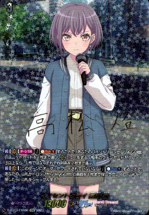 【起】【(V)】【ターン1回】:【コスト】[【ソウルブラスト】(1)]することで、あなたのバインドゾーンから〈MyGO!!!!!〉のユニットカードを1枚まで選び、(R)にコールする。相手のヴァンガードがグレード3以上なら、1枚ではなくそれぞれ別名を2枚まで選ぶ。