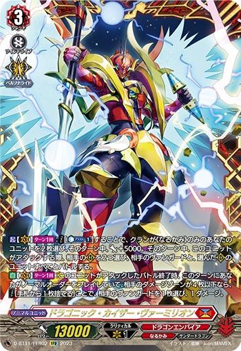 【起】【(V)】【ターン1回】:【コスト】[【カウンターブラスト】(1)]することで、クランが《なるかみ》のみのあなたのユニットを2枚選び、そのターン中、パワー+5000。そのターン中、このユニットがアタックする際、相手の(R)を2つ選び、相手のヴァンガードと、選んだ(R)のユニットすべてとバトルする。