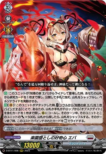 【自】【(V)】:このユニットがアタックした時、【コスト】[ソウルから「知恵の泉 エバ」を1枚バインドする]ことで、あなたの、山札か手札かドロップから「オブスクデイト」を含むカードを1枚まで探し、(R)にコールし、そのターン中、そのユニットとこのユニットのパワー+5000。山札から探したら、山札をシャッフルする。そのターン終了時、このコストでバインドされたカードを【レスト】でライドする。