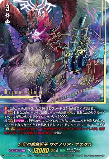 【起】【(V)】【ターン1回】:【コスト】[手札かソウルかドロップから、このユニットと別名の「マグノリア」を含むカードを1枚除外する]ことで、そのターン中、このユニットは『【自】【(V)】:あなたのリアガードが後列からヴァンガードにアタックした時、相手のリアガードを1枚選び、退却させる。』を得る。