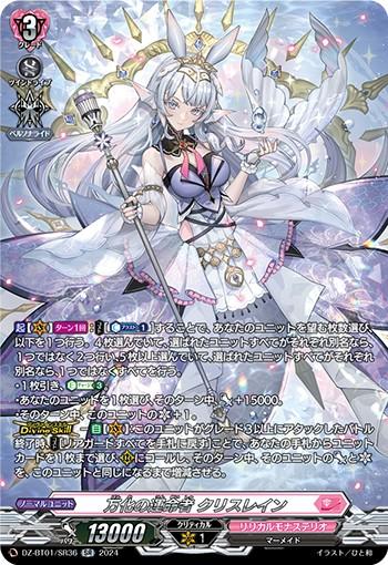 ディヴァインスキル-【自】【(V)】:このユニットがグレード3以上にアタックしたバトル終了時、【コスト】[リアガードすべてを手札に戻す]ことで、あなたの手札からユニットカードを1枚まで選び、(R)にコールし、そのターン中、そのユニットのパワーとクリティカルを、このユニットと同じになるまで増減させる。
