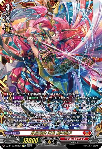 【自】【(V)】:このユニットが、アタックした時かアタックされた時、【コスト】[リアガードを2枚ソウルに置く]ことで、あなたのバインドゾーンから「忍」を含むカードを2枚まで選び、前列と後列の(R)にそれぞれ1枚ずつコールする。相手のバトルフェイズなら、前列と後列の(R)にコールではなく(G)に選んだカードすべてをコールする。