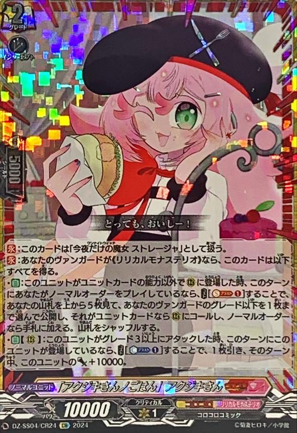 ・【自】:このユニットがユニットカードの能力以外で(R)に登場した時、このターンにあなたがノーマルオーダーをプレイしているなら、【コスト】[【ソウルブラスト】(1)]することで、あなたの山札を上から5枚見て、あなたのヴァンガードのグレード以下を1枚まで選んで公開し、それがユニットカードなら(R)にコールし、ノーマルオーダーなら手札に加える。山札をシャッフルする。