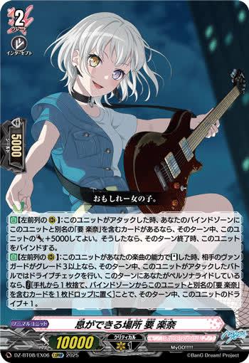 【自】【左前列の(R)】:このユニットがあなたの楽曲の能力で【スタンド】した時、相手のヴァンガードがグレード3以上なら、そのターン中、このユニットがアタックしたバトルではドライブチェックを行い、このターンにあなたがペルソナライドしているなら、【コスト】[手札から1枚捨て、バインドゾーンからこのユニットと別名の「要 楽奈」を含むカードを1枚ドロップに置く]ことで、そのターン中、このユニットのドライブ+1。