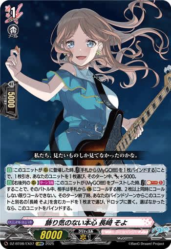 【自】【右後列の(R)】【ターン1回】:このユニットが〈MyGO!!!!!〉をブーストした時、【コスト】[【ソウルブラスト】(1)]することで、そのバトル中、相手は手札から(G)にコールする際、2枚以上同時にコールしない限りコールできない。そのターン終了時、あなたのバインドゾーンからこのユニットと別名の「長崎 そよ」を含むカードを1枚まで選び、ドロップに置く。選ばなかったなら、このユニットをバインドする。