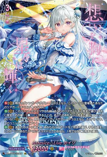 【自】【(V)】:あなたのターン終了時、あなたのリアガードを1枚まで選び、手札に戻す。このターンにあなたがペルソナライドしているなら、1枚ではなく2枚まで選ぶ。