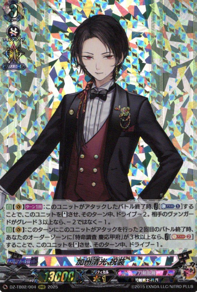 【自】【(V)】:このターンにこのユニットがアタックを行った2回目のバトル終了時、あなたのオーダーゾーンに「特命調査 慶応甲府」が3枚以上なら、【コスト】[【ソウルブラスト】(2)]することで、このユニットを【スタンド】させ、そのターン中、ドライブ-1。