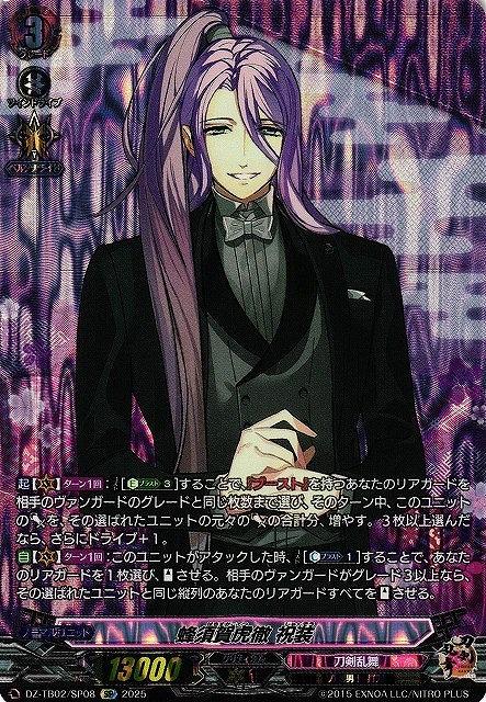【自】【(V)】【ターン1回】:このユニットがアタックした時、【コスト】[【カウンターブラスト】(1)]することで、あなたのリアガードを1枚選び、【スタンド】させる。相手のヴァンガードがグレード3以上なら、その選ばれたユニットと同じ縦列のあなたのリアガードすべてを【スタンド】させる。