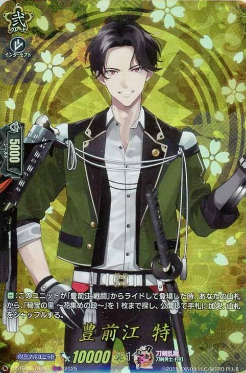 【自】:このユニットが「豊前江 戦闘」からライドして登場した時、あなたの山札から、「秘宝の里 〜花集めの段〜」を1枚まで探し、公開して手札に加え、山札をシャッフルする。