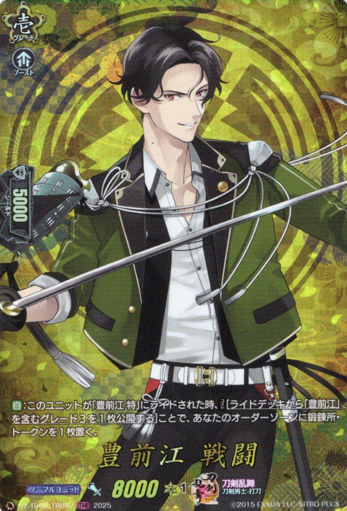 【自】:このユニットが「豊前江 特」にライドされた時、【コスト】[ライドデッキから「豊前江」を含むグレード3を1枚公開する]ことで、あなたのオーダーゾーンに鍛錬所・トークンを1枚置く。
